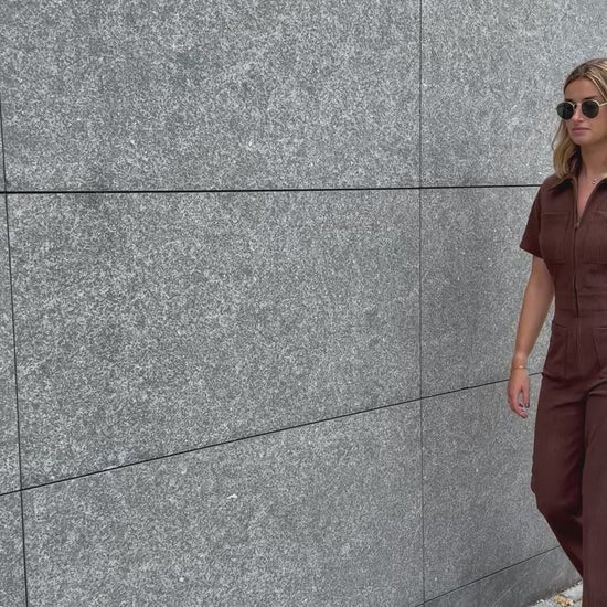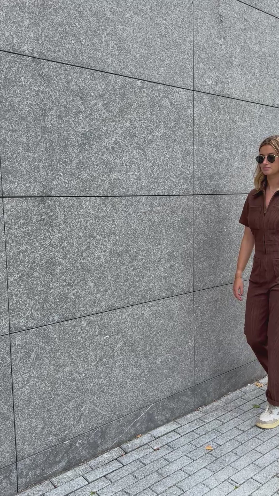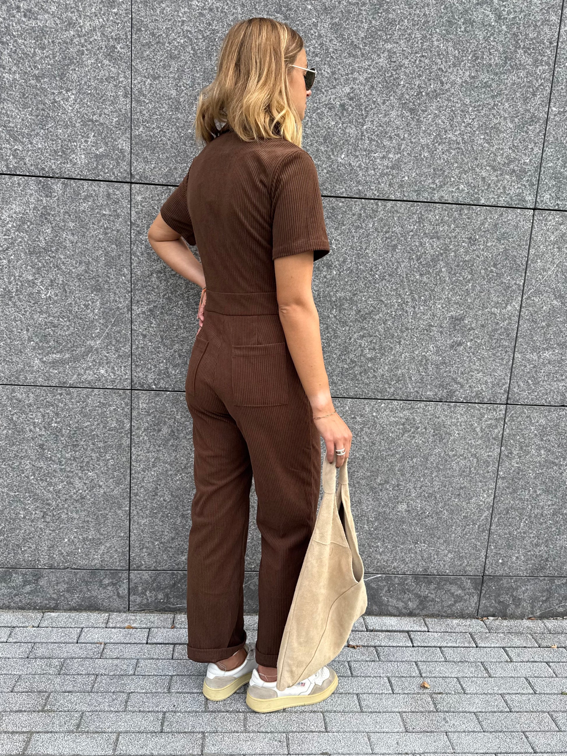 - Women’s corduroy jumpsuit with short sleeves and long legs